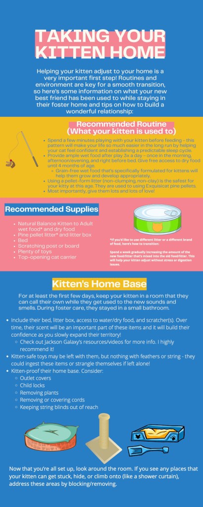 - Clean the kitten’s litter box daily. Using a pellet-form litter (non-clumping, non-clay) is the safest for your kitten when they’re under one year old.