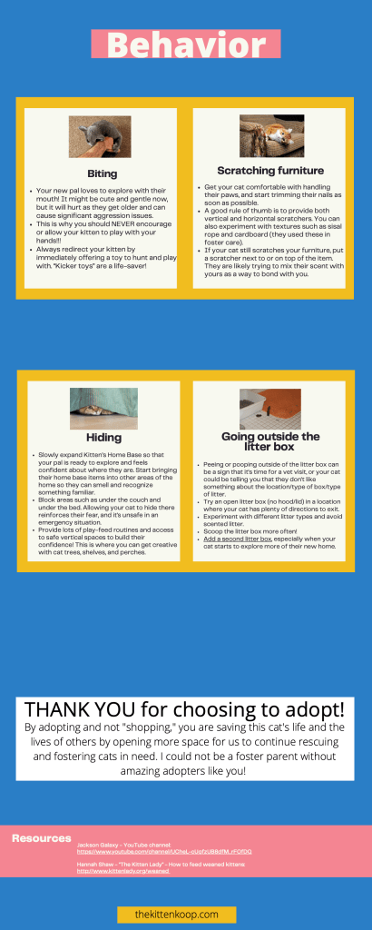 Now that you’re all set up, look around the room. If you see any places that your kitten can get stuck, hide, or climb onto (like a shower curtain), address these areas by blocking them or removing the potential problems. Read more about setting up your kitten’s home base in The Ultimate Guide to Setting Up Your Kitten Room!