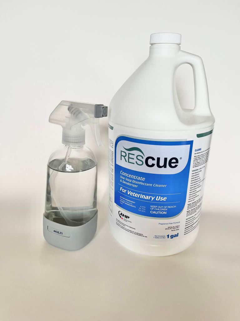 Start by choosing your disinfectant. You can either make a 1 to 32 ratio of bleach and water (very affordable but has to be rinsed afterwards) or dilute the Rescue disinfectant (more expensive but kills all viruses and doesn’t have to be rinsed).