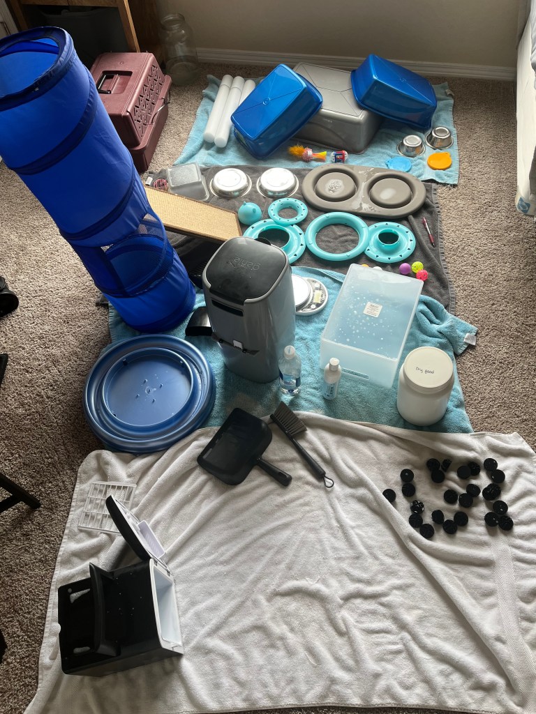 Cleaning and disinfecting is a crucial component of a fostering routine. It must be done thoroughly in order to prevent and stop the spread of illness, bacteria, and parasites. Gather the necessary supplies listed below and begin by cleaning every item, room, and playpen that was used or contaminated. Once cleaned, each item must be disinfected with a commercial product such as a bleach solution or Rescue. Continue reading for the full list of supplies and to learn how to disinfect specific items.